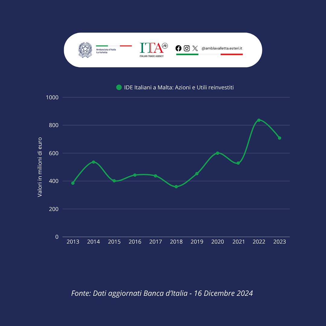 Nel periodo 2013-2023, la componente azionaria e degli utili reinvestiti degli investimenti diretti esteri italiani a Malta ha mostrato una crescita costante e solida. Si parte da 385 milioni di euro nel 2013, con un andamento in crescita che raggiunge un picco di 836 milioni nel 2022, confermando la tendenza delle imprese italiane a reinvestire i propri profitti nel mercato maltese per consolidare la presenza e sviluppare ulteriormente le attività locali. Nel 2023 si registra un leggero calo a 708 milioni, ma il valore rimane comunque molto elevato, a testimonianza di una relazione economica forte e duratura. Questi dati indicano come le società italiane vedano Malta non solo come un mercato di sbocco ma come un luogo strategico per investimenti a lungo termine, soprattutto in settori come finanza, servizi e tecnologie emergenti.
